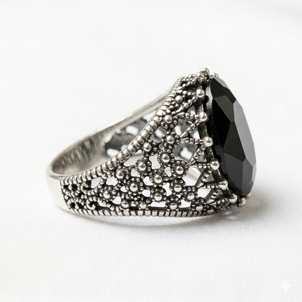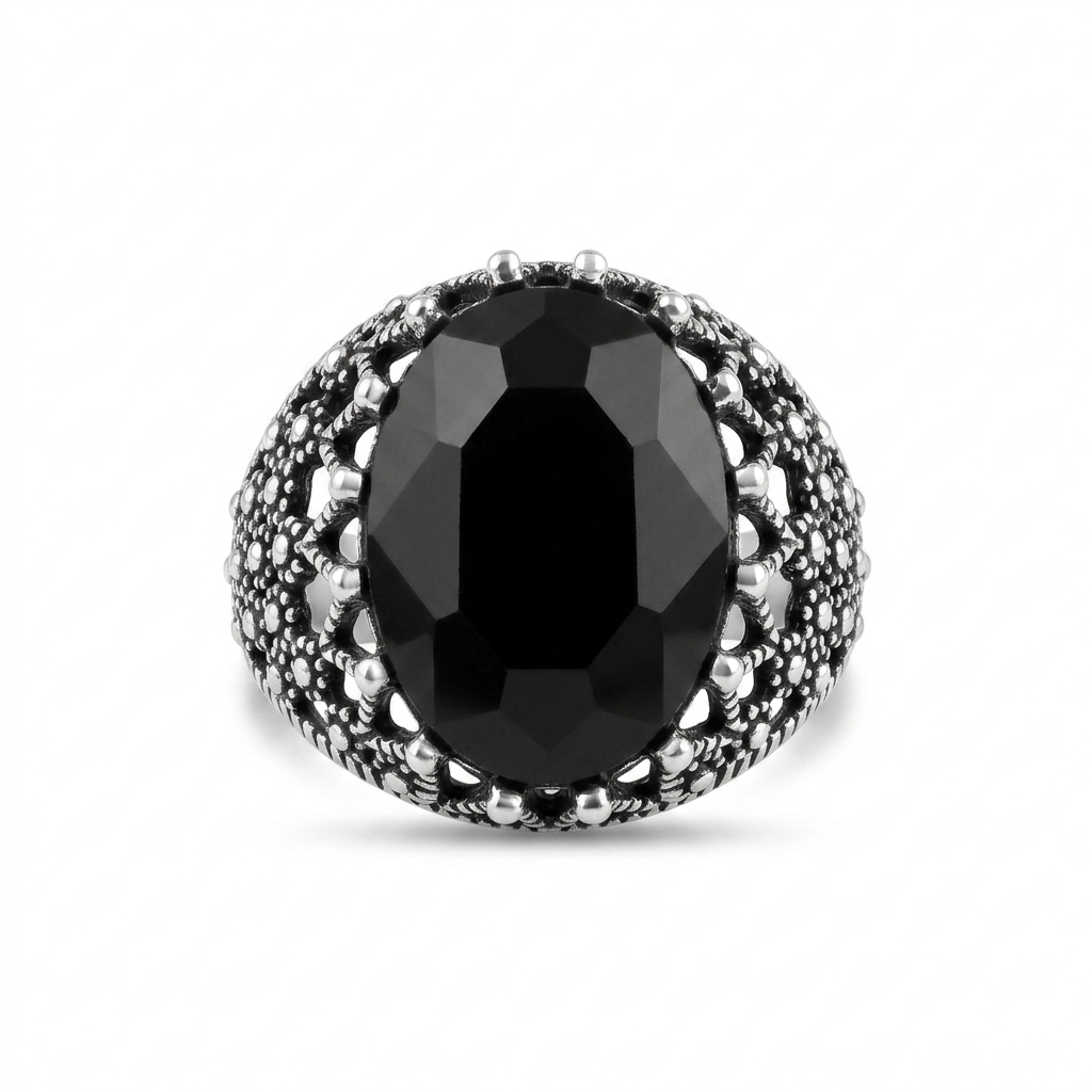 The Diloze Signature Black Onyx Oval Ring commands respect with its dark, sophisticated presence — a large, deeply faceted oval black onyx crystal secured by refined beaded prongs, set against an exquisite background of open filigree lacework in oxidized antique silver. The high-polish facets pull endless depth from the dark stone, while the richly textured band detailing adds an ancient, aristocratic edge.