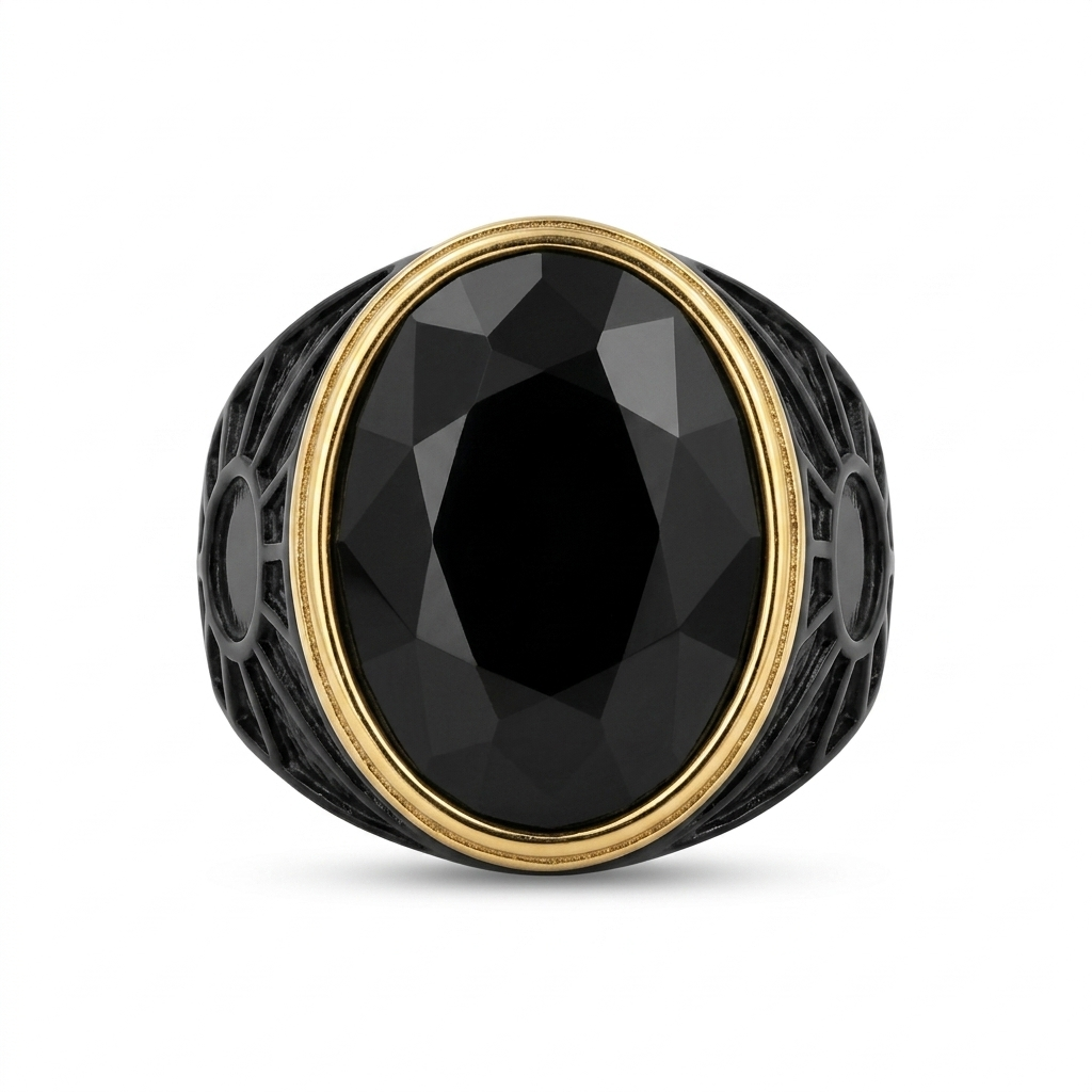 Stone: Oversized faceted oval black onyx — deep, multi-dimensional cut