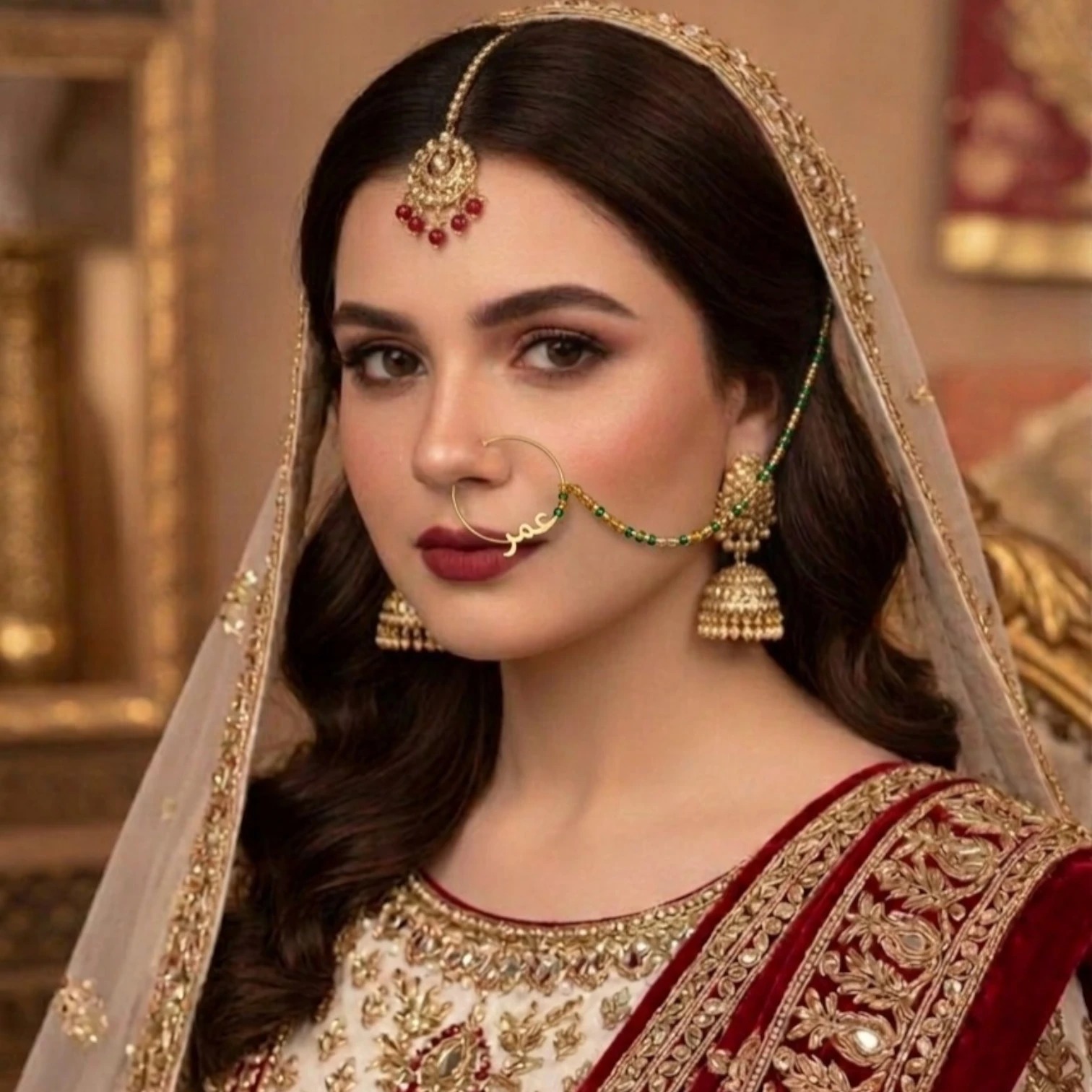 Larger in scale than a traditional nath, this piece is designed to be noticed — a showstopping bridal accessory that carries your name with pride on your most special day.