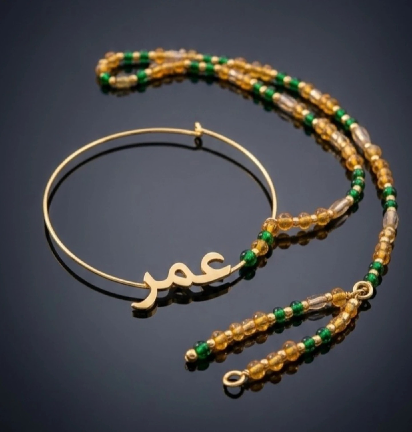 Bold, colorful, and completely yours. The Diloze Signature Arabic Name Nath features your chosen name in clean, raised Arabic/Urdu calligraphy on a large statement gold hoop — finished with a long, vibrant beaded chain in amber and emerald tones for a rich, festive bridal look.