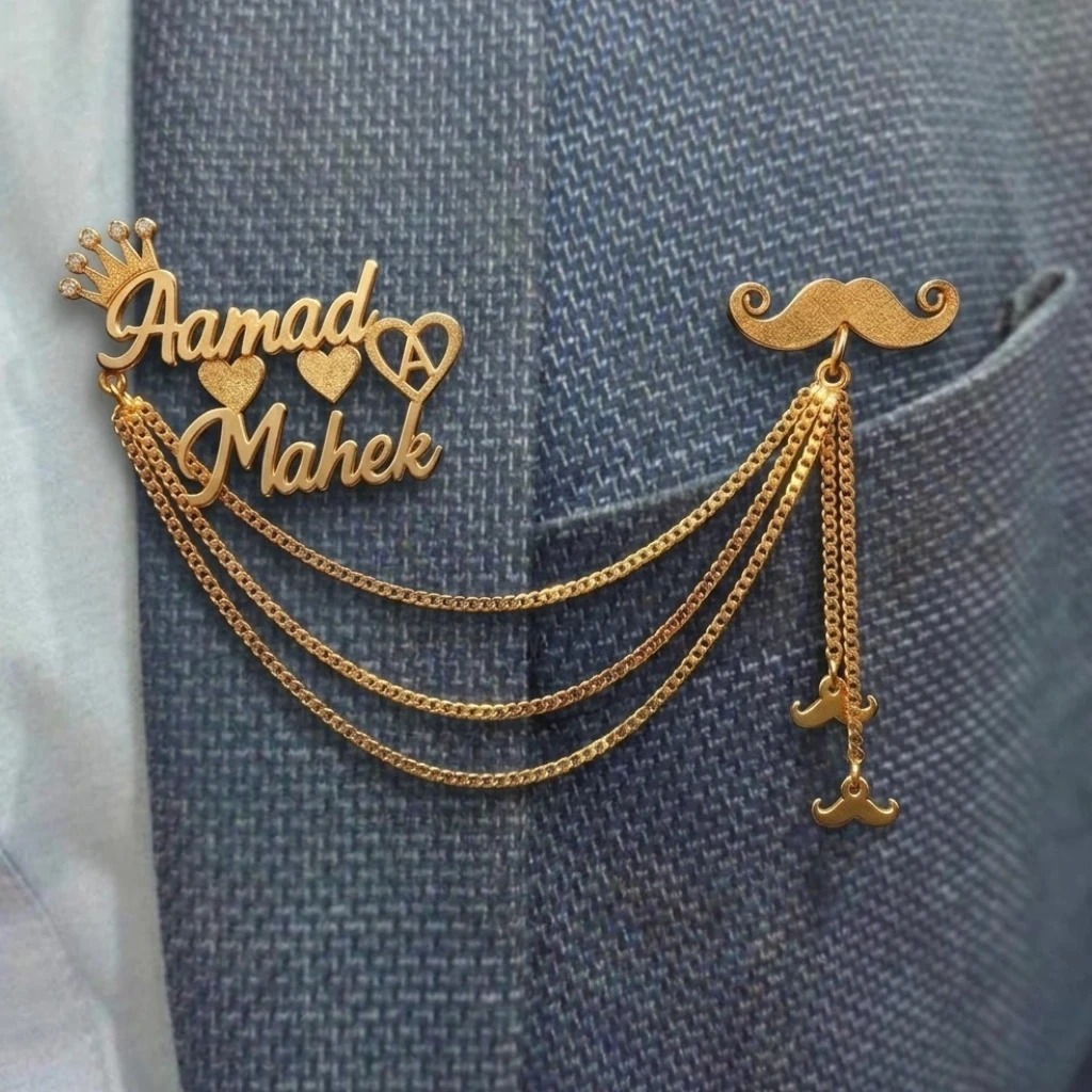 The finishing touch that sets the groom apart. The Diloze Signature Couple Name Groom Brooch is a stunning lapel accessory featuring both the bride and groom’s names in gold cursive script with heart accents and a crown detail and connected by cascading gold chains to a matching moustache brooch on the pocket. Bold, personal, and made for the spotlight.