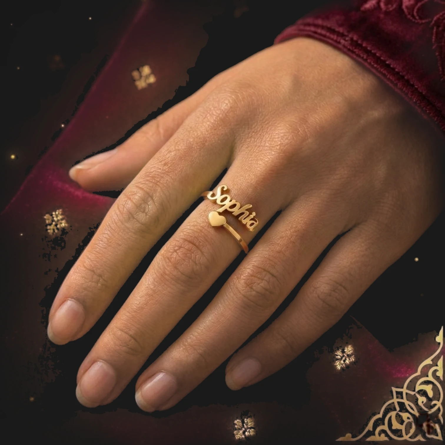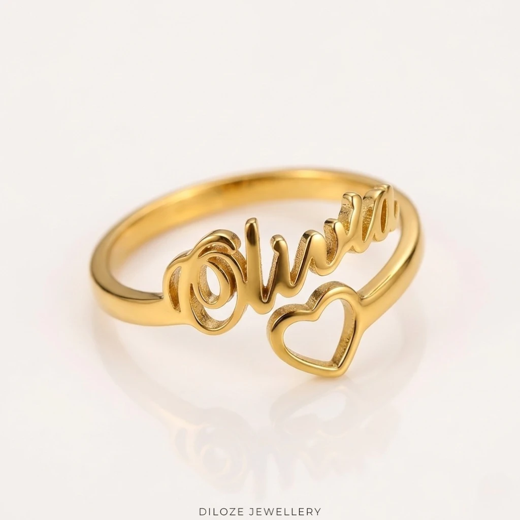 Wear your name like never before with the Diloze Signature English Script Name Ring. Featuring your chosen name in elegant cursive lettering alongside a sweet heart accent, this open-wrap ring is the perfect combination of personal meaning and timeless style.