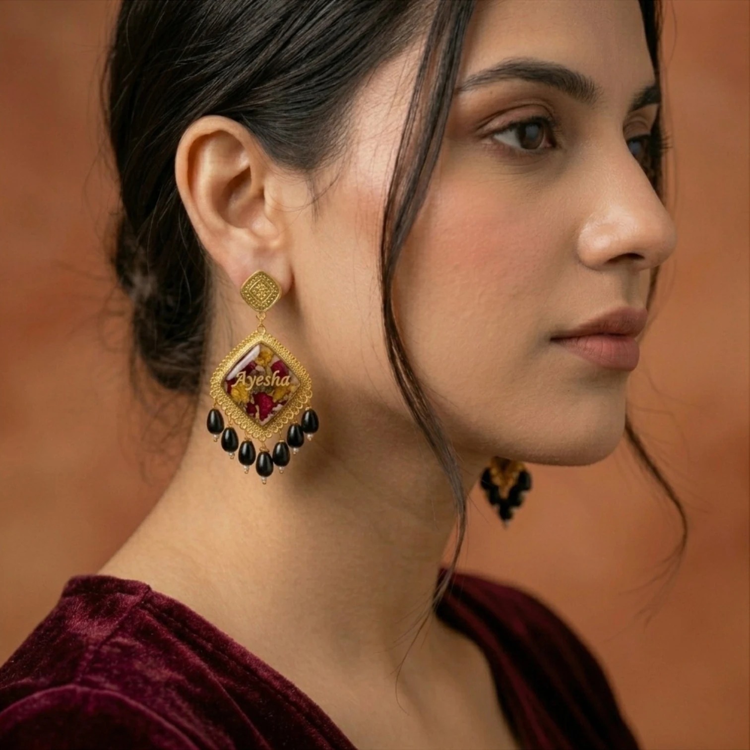 Where art meets identity — introducing the Diloze Signature Custom Resin Name Earrings. Each pair is a one-of-a-kind wearable artwork, featuring your chosen name engraved in gold lettering set within a rich, deep-toned resin panel encased in an ornate gold filigree frame. Finished with cascading black bead drops, these earrings blend South Asian traditional aesthetics with modern personalization.