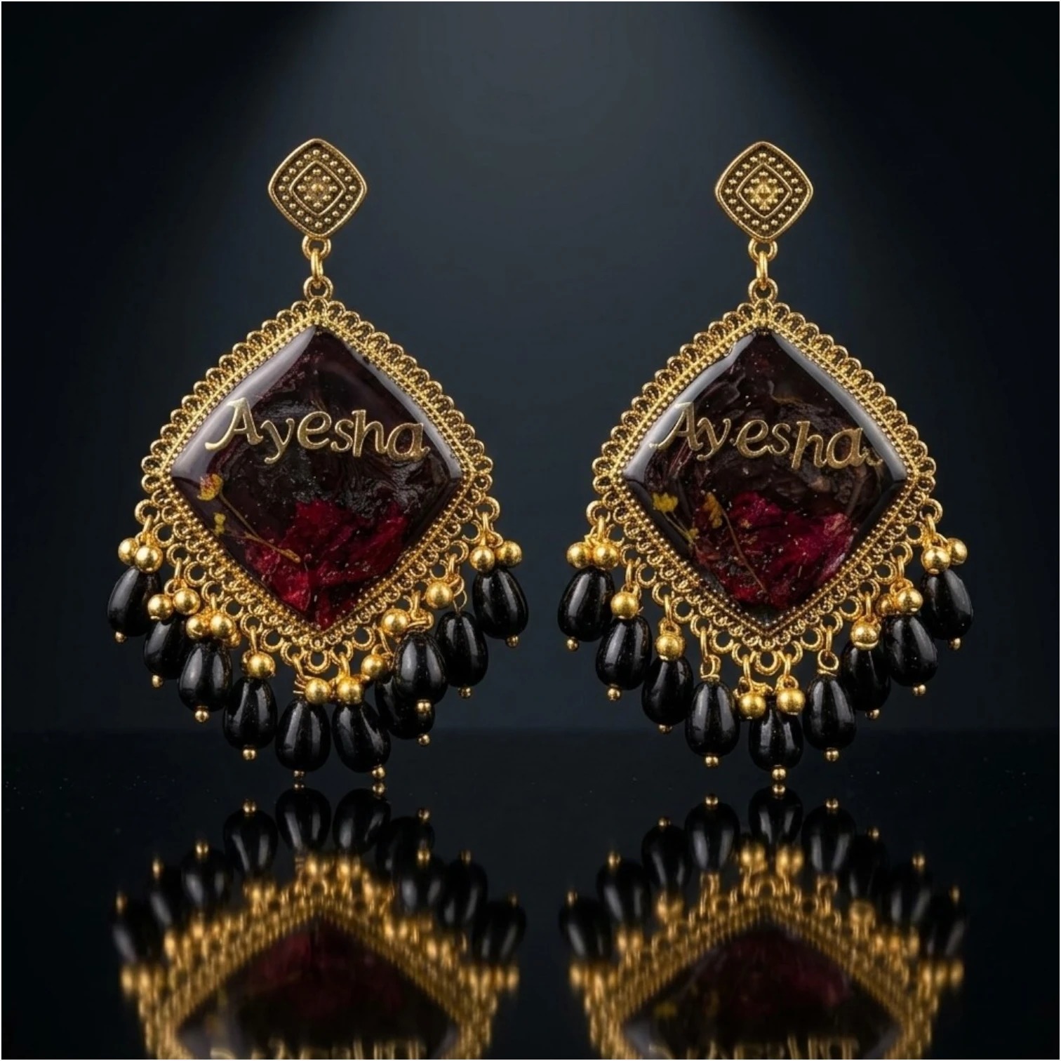 Where art meets identity — introducing the Diloze Signature Custom Resin Name Earrings. Each pair is a one-of-a-kind wearable artwork, featuring your chosen name engraved in gold lettering set within a rich, deep-toned resin panel encased in an ornate gold filigree frame. Finished with cascading black bead drops, these earrings blend South Asian traditional aesthetics with modern personalization.