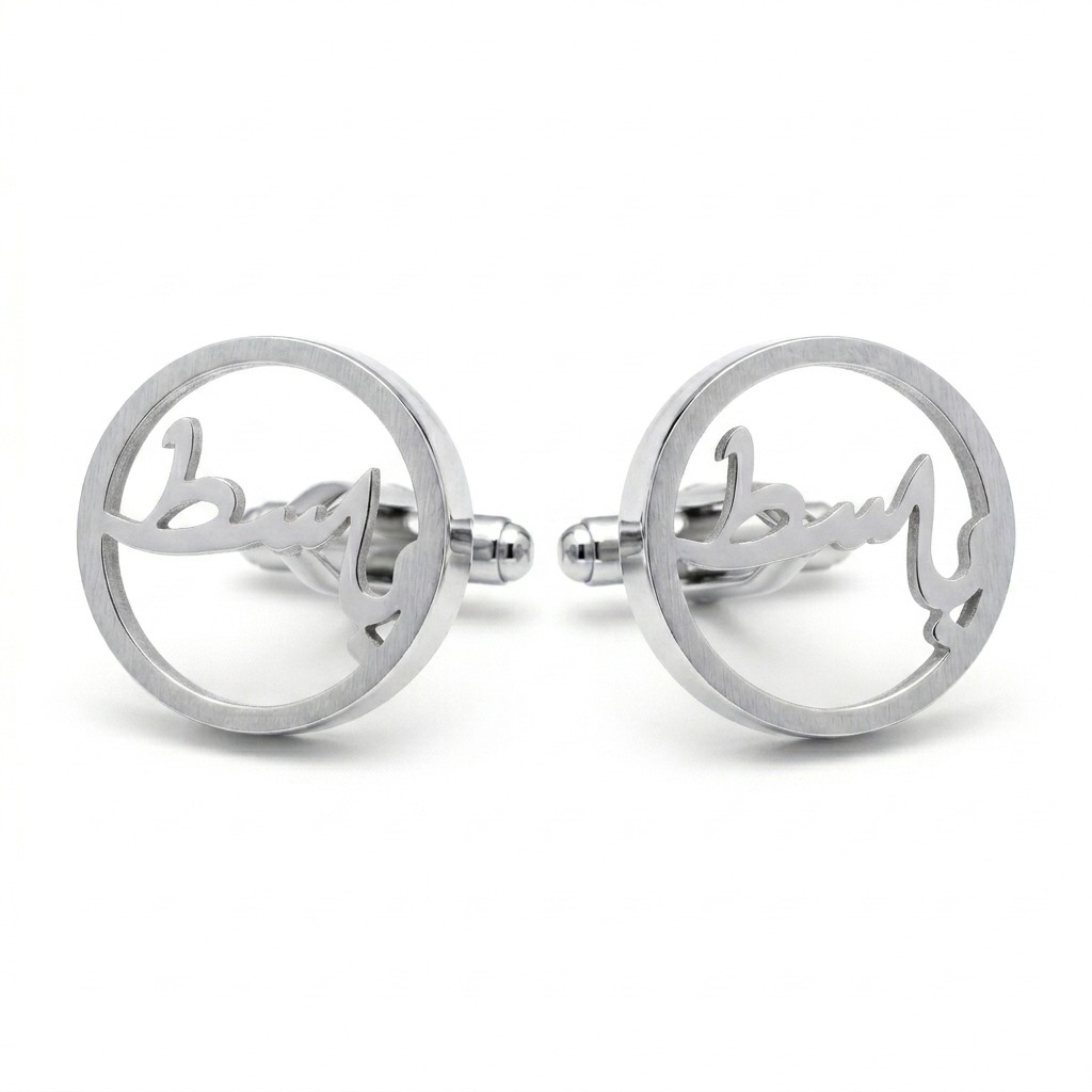 The Diloze Signature Round Frame Calligraphy Cufflinks set your name inside a clean circular silver frame and flowing Urdu or Arabic script sitting open and proud within the brushed silver ring. The open-work design lets the script breathe, creating a cufflink that feels lightweight yet looks substantial. Elegant from every angle, cultural at its core.