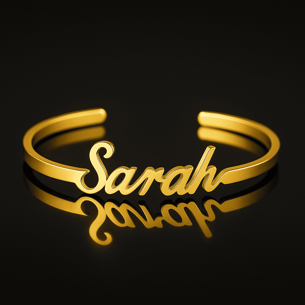 It’s made from high-quality sterling silver. Then we plate it with 14k gold. You get the beautiful, real gold look without the high price. This engraved name bangle won’t irritate your skin. It is hypoallergenic and has no nickel. We build it to last. This piece will be stunning for many years.