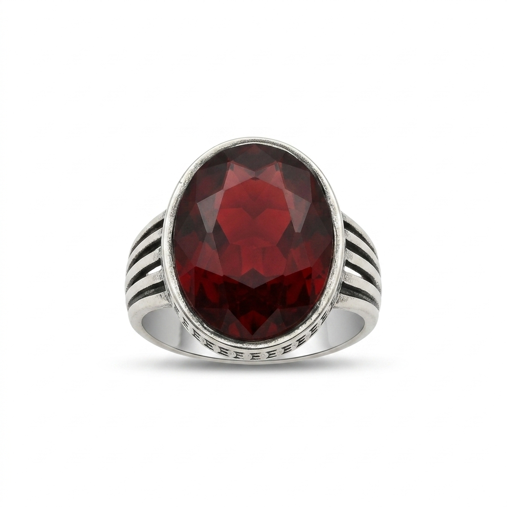 The Diloze Signature Red Garnet Oval Ring commands attention the moment it catches light — a large, deeply faceted oval ruby-red crystal blazing from a clean bezel setting, flanked by bold ribbed shoulders in oxidized antique silver. The multi-cut facets pull depth and fire from every direction, while the engraved band detailing adds a rugged, old-world edge.