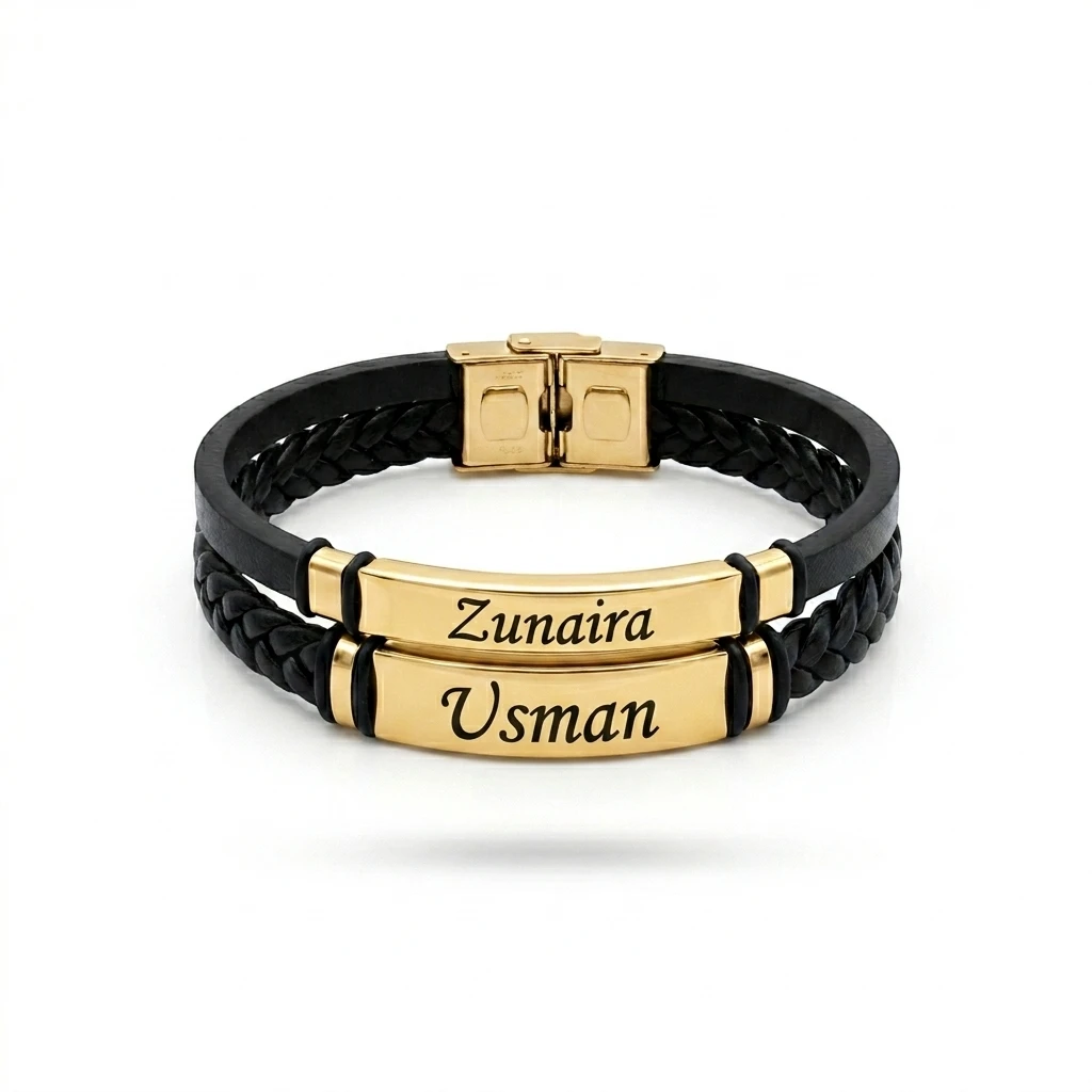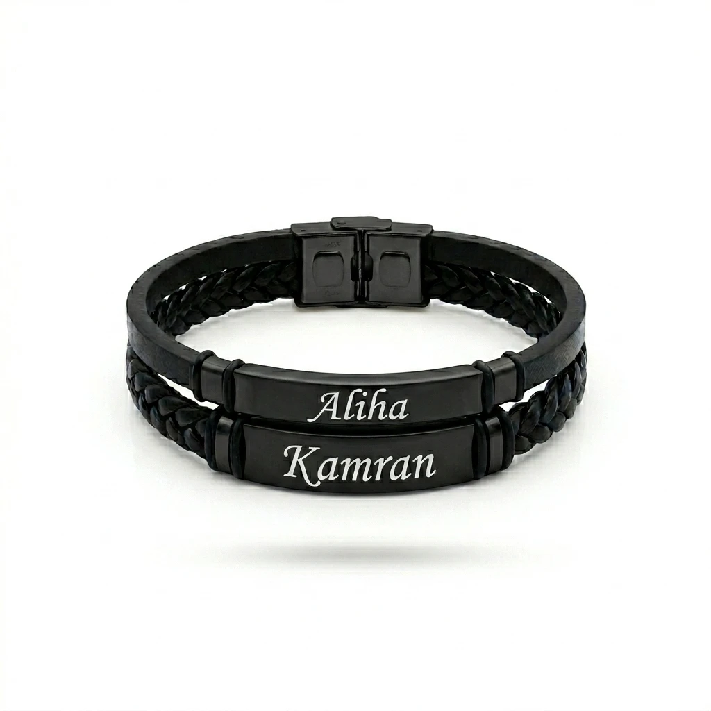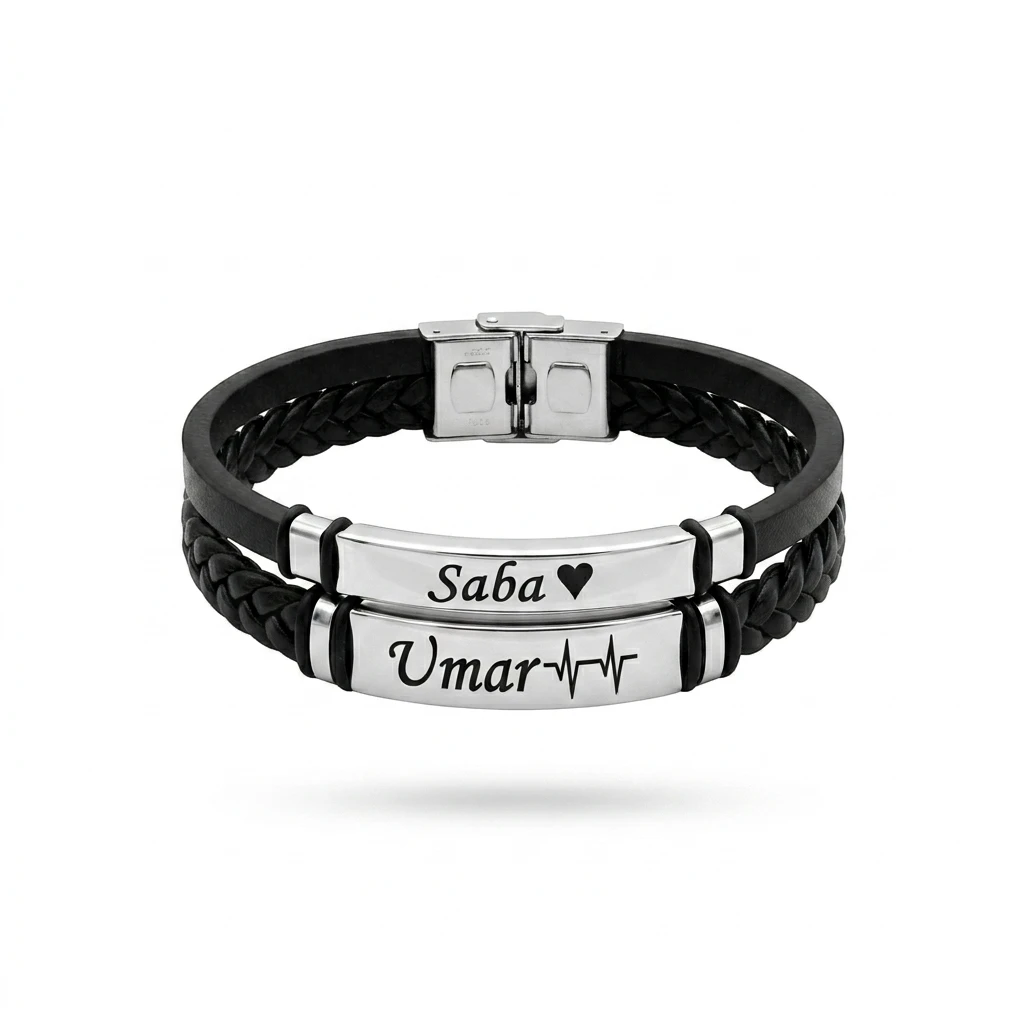The Diloze Signature Heartbeat Couple’s Bracelet features a sophisticated dual-layer design—combining smooth leather and rugged braided textures. Two polished stainless steel plates sit at the centre, precision-engraved with “Saba” and “Umar” alongside a lifeline heartbeat symbol. This piece is engineered to represent two lives intertwined, secured by a high-grade mechanical clasp for a lifetime of wear.