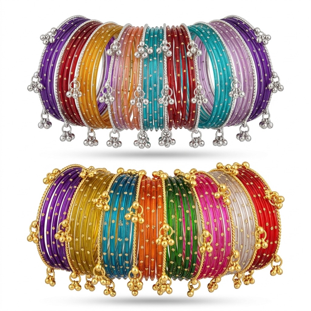 Design: Slim multicolour bangles with dot detailing & dangling bell charm clusters