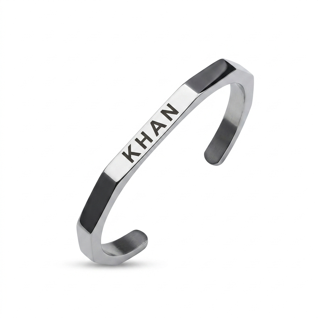 The Diloze Signature Geometric Cuff is a masterclass in architectural minimalism and featuring a multi-faceted hexagonal profile in brushed silver steel accented by sleek black enamel inlays. This isn’t just an accessory; it’s a canvas for your legacy, with a high-precision laser-engraved centre plate designed to carry your name with pride.