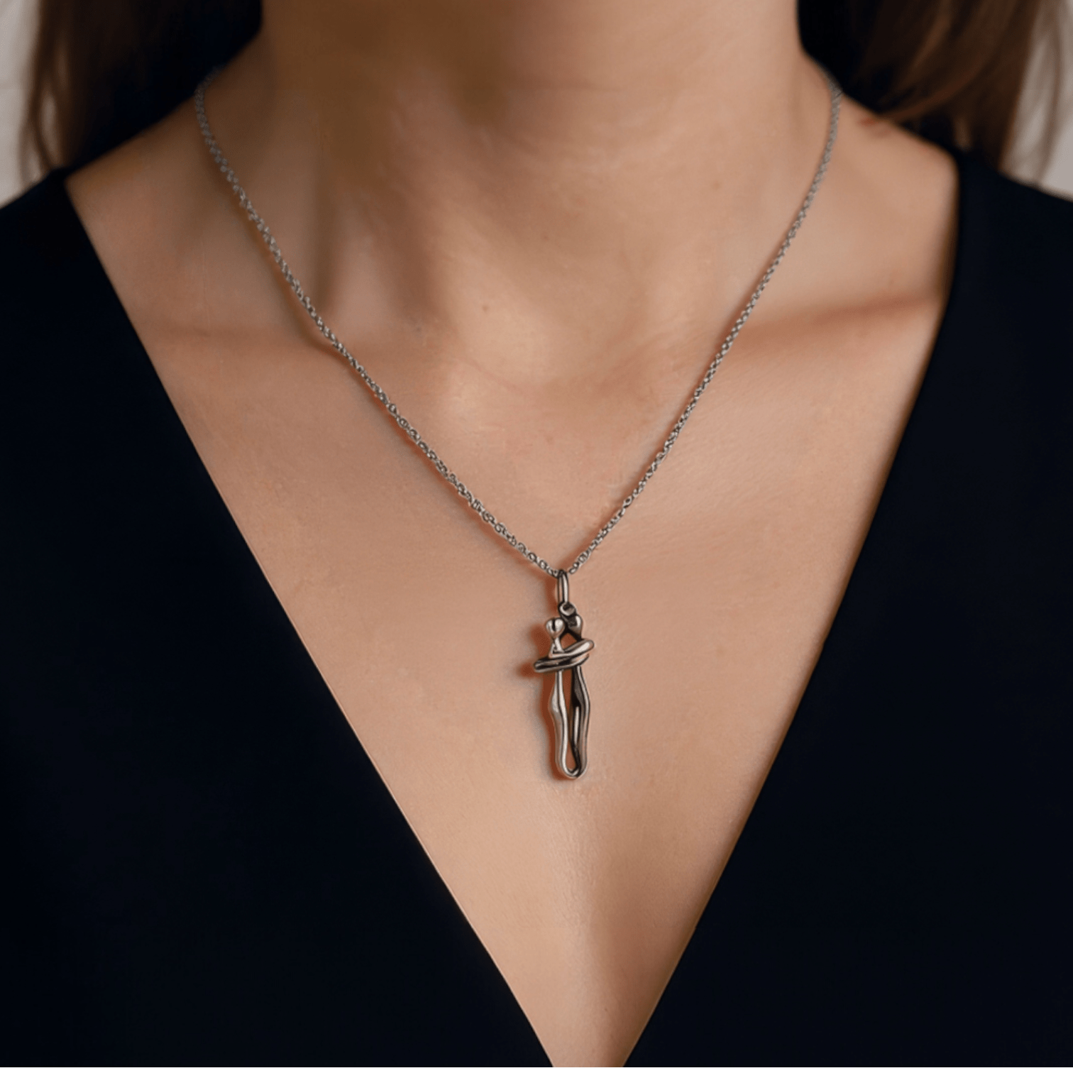 Celebrate love in its purest form, order your golden silver couple hugging necklace today and carry your connection close to your heart.