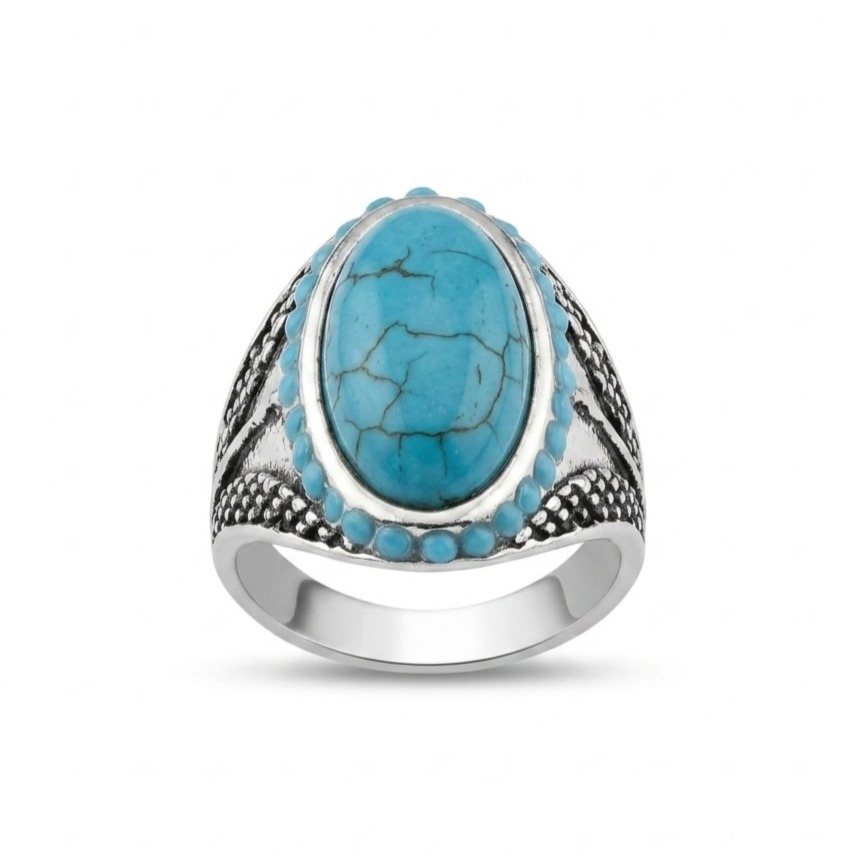 The Diloze Signature Turquoise Oval Ring brings a calm but powerful energy to your hand — a large, smooth oval turquoise cabochon with natural dark veining, cradled by a unique halo of turquoise-colored beading. The band features a heavy oxidized antique silver finish with architectural mesh and scale-like engravings, giving it the weight and feel of a desert relic.